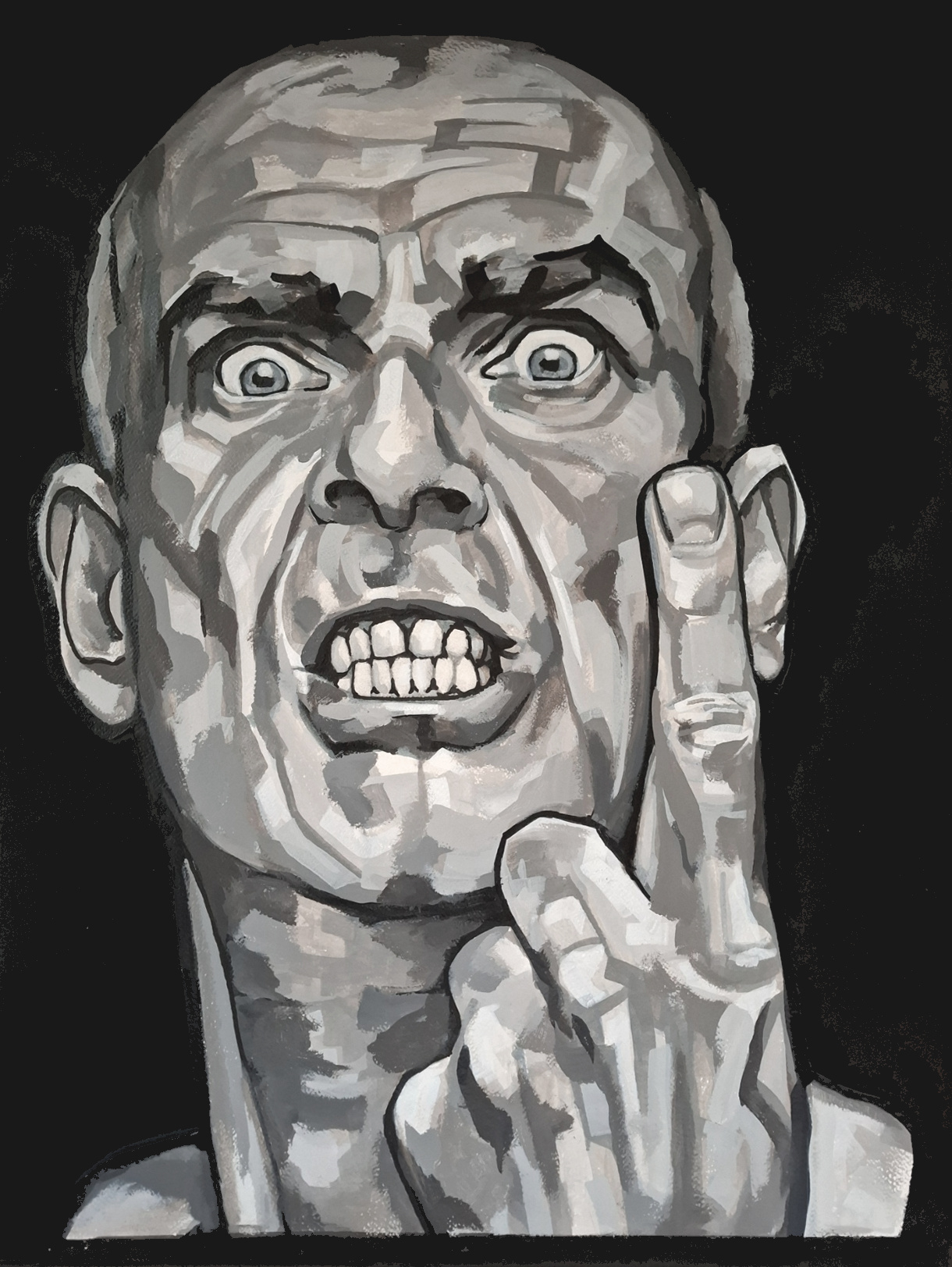 ‘Lachen!’ (2010) is gemaakt als kritiek op de noodzaak van een ontbloot gebit bij onze tegenwoordige selfies en snapshots. Probleempje met die ironie, is dat dit eigenlijk wel een grappig portret is geworden. En dus is het als kritische noot mislukt. Ik had het vooraf veel grimmiger in m’n hoofd.